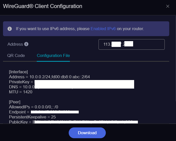 - Repeat the previous step, however, this time instead of downloading the QR code, whilst still within the Wireguard Client Configuration section on the Wireguard Server, click 'Configuration File' and then select 'Download'