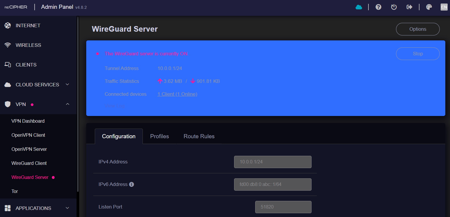 - Click VPN, Wireguard Server, and on the right hand side, select 'Options' to set the following options:
