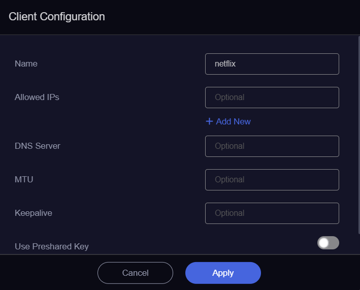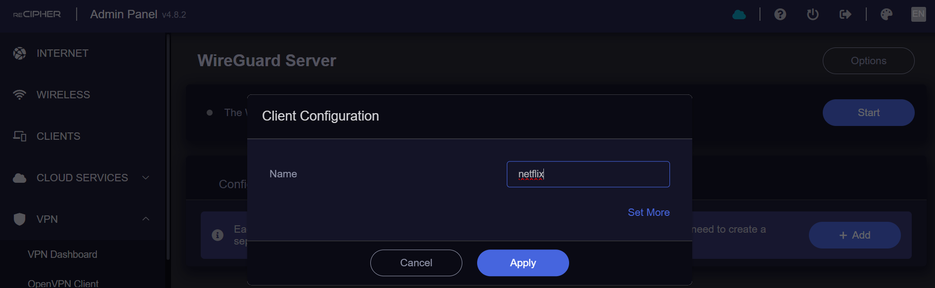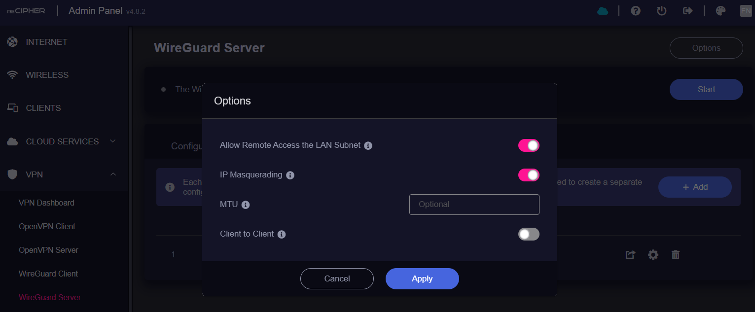 - Click Apply and then proceed to Start the Wireguard VPN Server