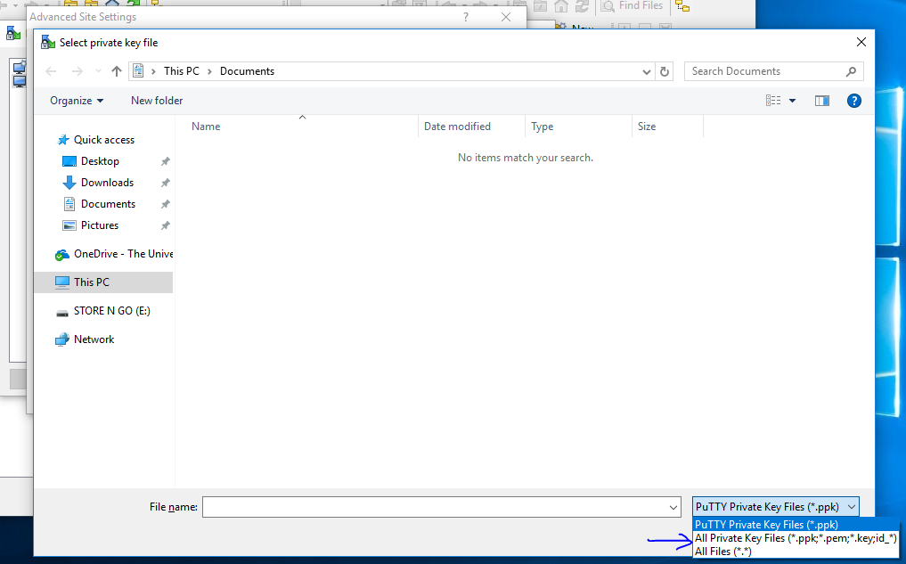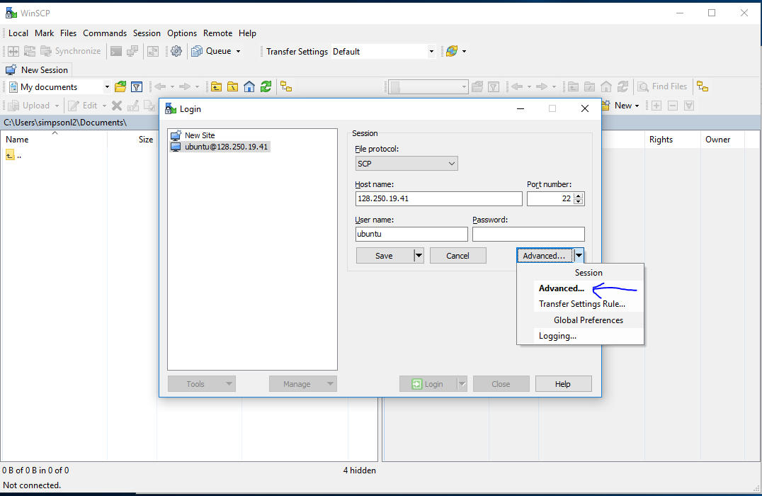 When you start, you will see this screen. Fill out the details, drop down the menu to choose SCP, put in the IP address and the user name, then click the ‘Advanced’ drop down menu.